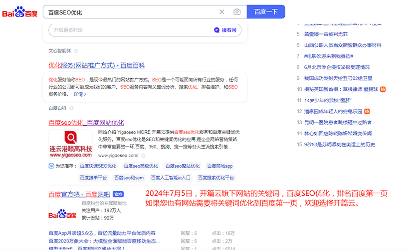 2024年7月5日,開篇云旗下網站關鍵詞,百度SEO優化,優化排名到百度第一頁,如果您也有網站關鍵詞需要百度SEO優化,歡迎咨詢開篇云。