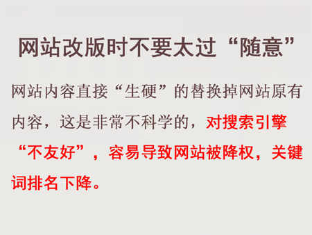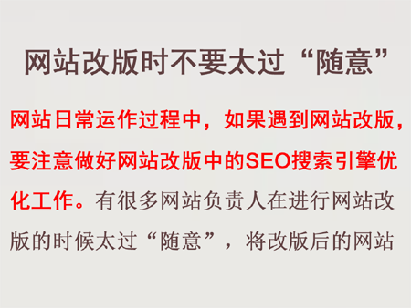 網站改版時不要太過“隨意”。網站日常運作過程中,如果遇到網站改版,要注意做好網站改版中的SEO搜索引擎優化工作。有很多網站負責人在進行網站改版的時候太過“隨意”,將改版后的網站內容直接“生硬”的替換掉網站原有內容,這是非常不科學的,對搜索引擎“不友好”,容易導致網站被降權,關鍵詞排名下降。