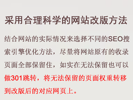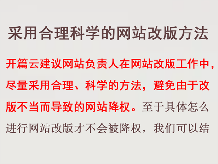 采用合理科學的網站改版方法。開篇云建議網站負責人在網站改版工作中,盡量采用合理、科學的方法,避免由于改版不當而導致的網站降權。至于具體怎么進行網站改版才不會被降權,我們可以結合網站的實際情況來選擇不同的SEO搜索引擎優化方法,盡量將網站原有的收錄頁面全部保留住,如實在無法保留也可以做301跳轉,將無法保留的頁面權重轉移到改版后的對應網頁上。